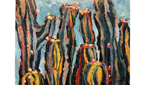 Hodges is a Dallas artist whose work is known for its bold color and expressive brushwork. She attacks the surface with brushes, spatulas, sticks and other tools to make texture on the canvas. Subjects include architectural cacti, canyon geology landscape, and crisp still life. “I can find beauty in the structure of a dead cactus or a playful dog…All are waiting to be painted if I just look and let the paint fly.”