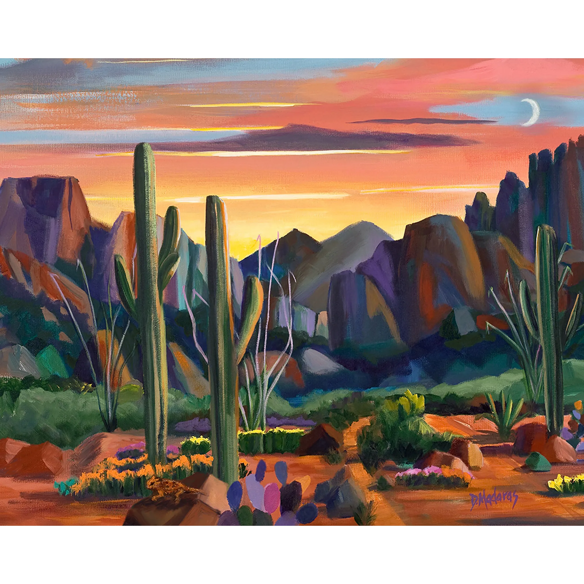This lively desertscape incorporates earthy browns, rusty reds, and burnt sienna hues, making it a natural complement to any Southwestern home. Mighty saguaros stand tall in the foreground of this dramatic scene on the west side of Tucson.