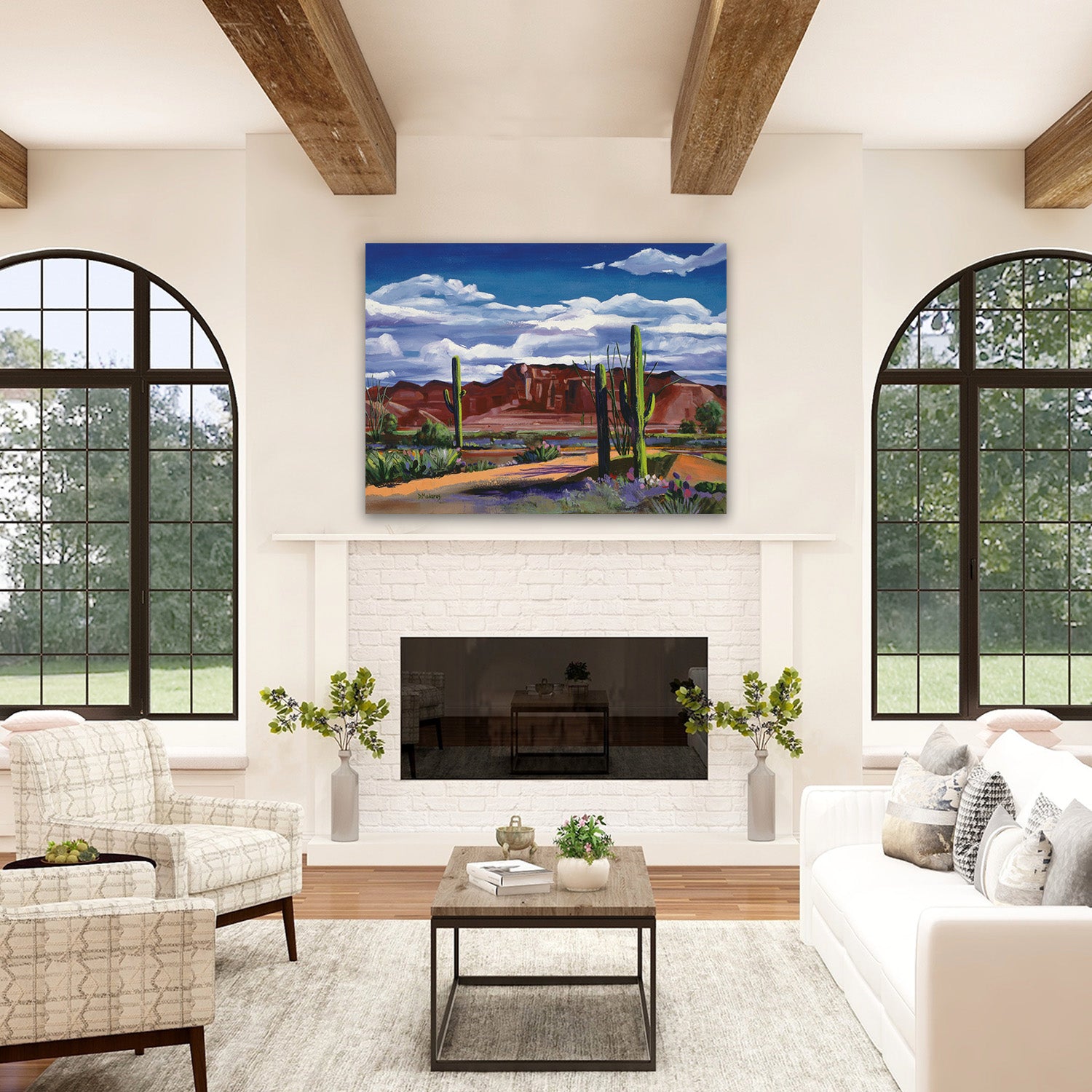 Middle of the Desert– During a drive back from California in April, I fell asleep in the passenger seat. When I awoke, we were somewhere in the middle of the desert on I-10 and I saw a magnificent cloud formation over the mountains. I knew immediately that I wanted to paint the scene, so as we sped along the highway, I snapped a few photos to preserve details for future reference.