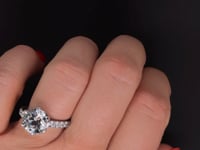 Center stone is a round 10 mm, and it’s diamond equivalent weight is approximately 2.5 carats.