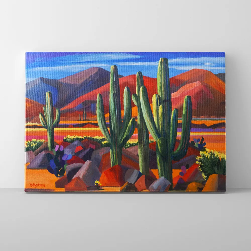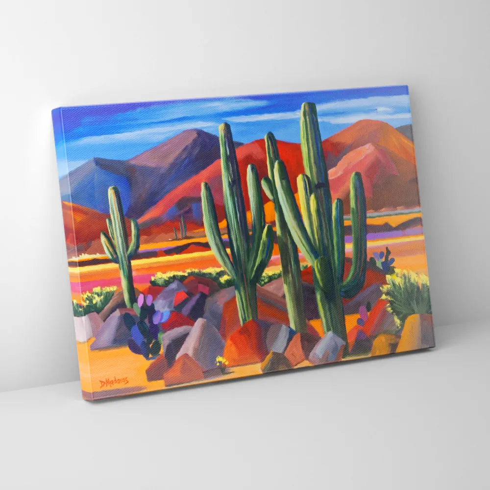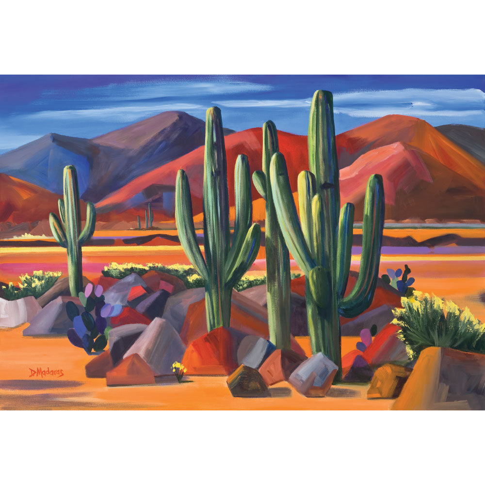 This lively desertscape incorporates earthy browns, rusty reds, and burnt sienna hues, making it a natural complement to any Southwestern home. Mighty saguaros stand tall in the foreground of this dramatic scene on the west side of Tucson.