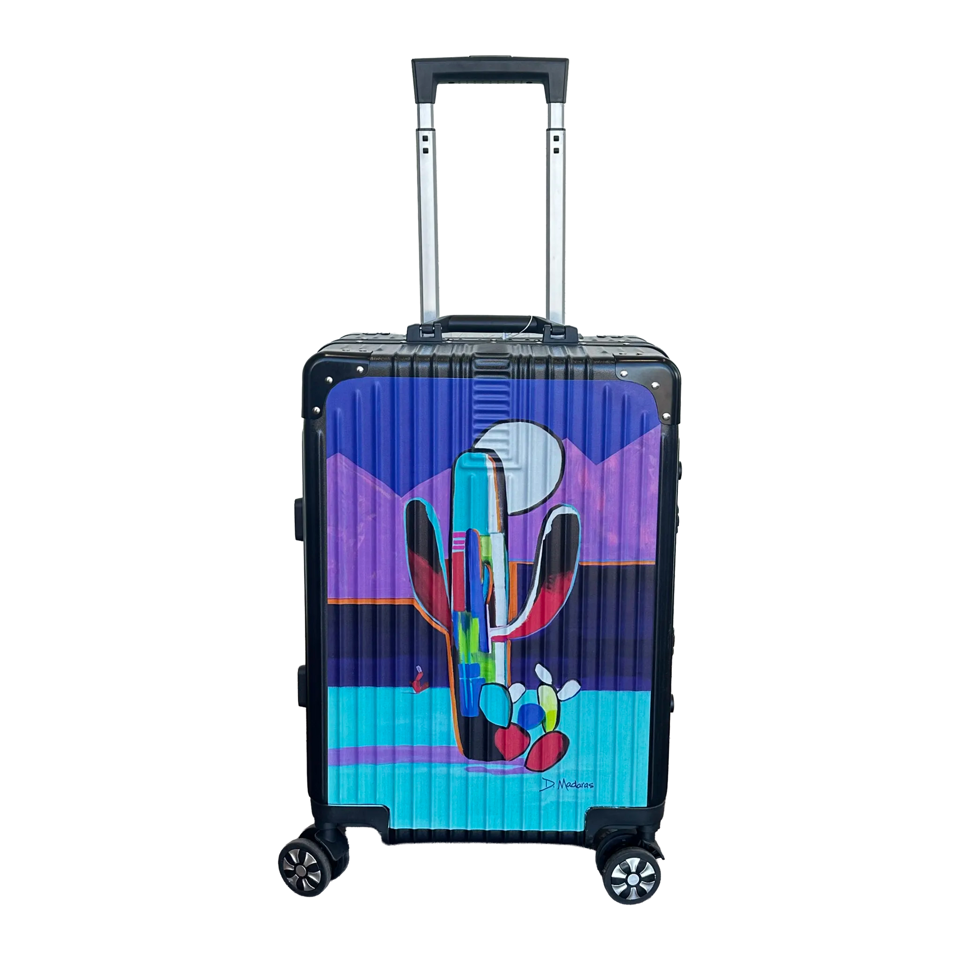 This suitcase features the painting, “Saguaro Nieto" by Diana Madaras, transforming everyday travel into a moving gallery. The retractable handle glides smoothly, while secure locking clasps keep your belongings safe. Inside, two well-placed interior pockets offer neat, intuitive organization. Functional sophistication meets artistic expression in a suitcase that’s as beautiful as it is practical.
