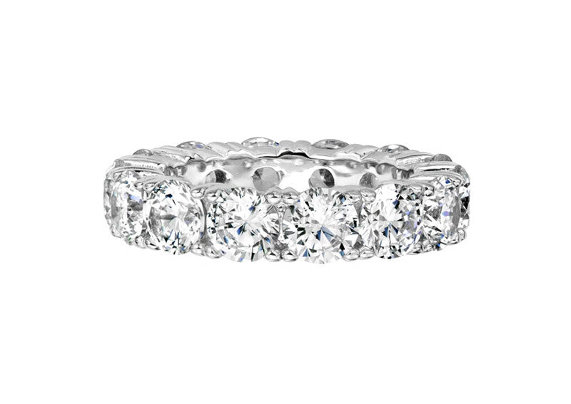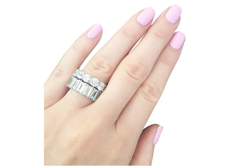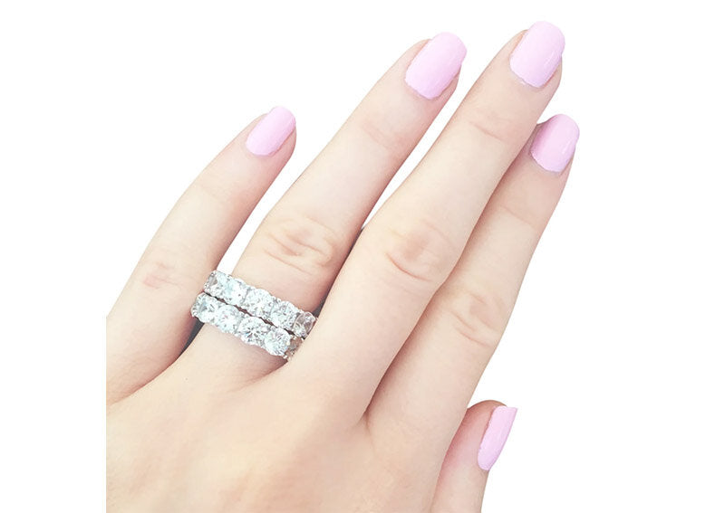 Exquisite round eternity band is an ideal travel and everyday piece. Stones are meticulously hand faceted and set as the finest estate diamonds for unparalleled light refractivity. Each stone is held by four prongs for added security. Each stone is approximately .5 carats. Ring looks exquisite stacked with another ring of the same style, or with our 4mm Round Eternity Band, or Emerald Cut Eternity Ring Band. Additional images show it stacked with two of this 5mm style as well as with our Emerald Cut Eternity Ring Band. Please view additional images of rings shown on model. When stacking two or more rings together, we suggest selecting one size larger in both ring styles. Please indicate your ring size in the size box.