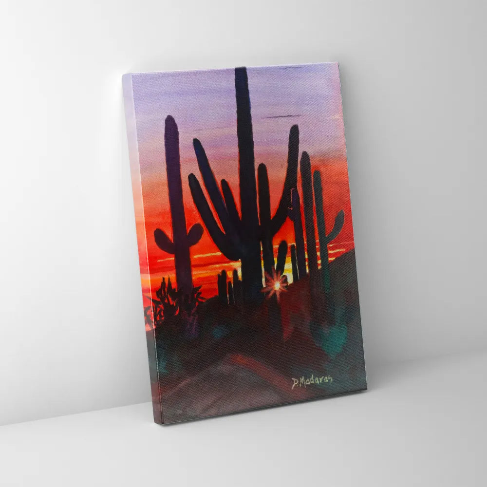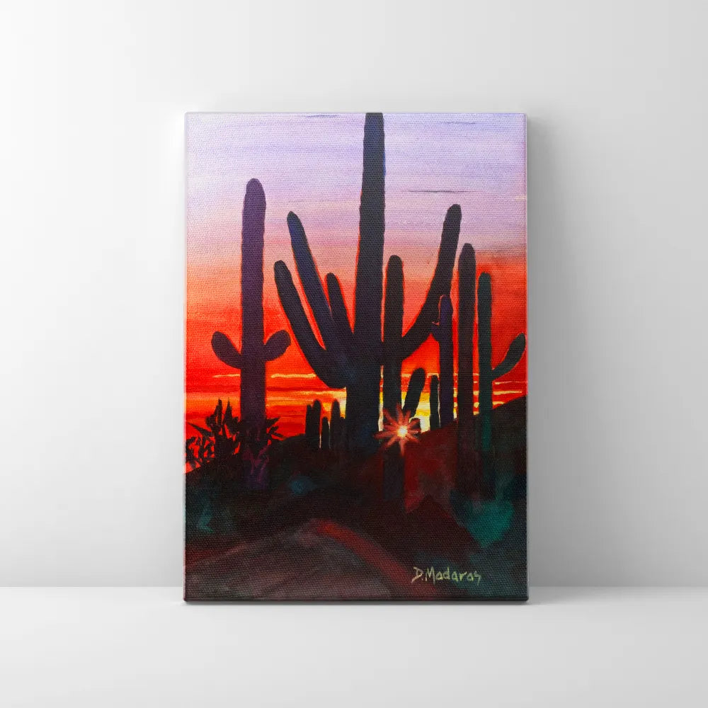 Sunset at Dove Mountain - It’s breathtaking to be present during a fiery Arizona sunset and witness the exact moment the sun’s rays burst forth from beneath the arm of an ancient saguaro. Centuries ago, pioneers in covered wagons might have stood on the same ground and witnessed this scene with just as much awe. This painting then inspired a very large six-piece canvas created for Lexus of the United States.