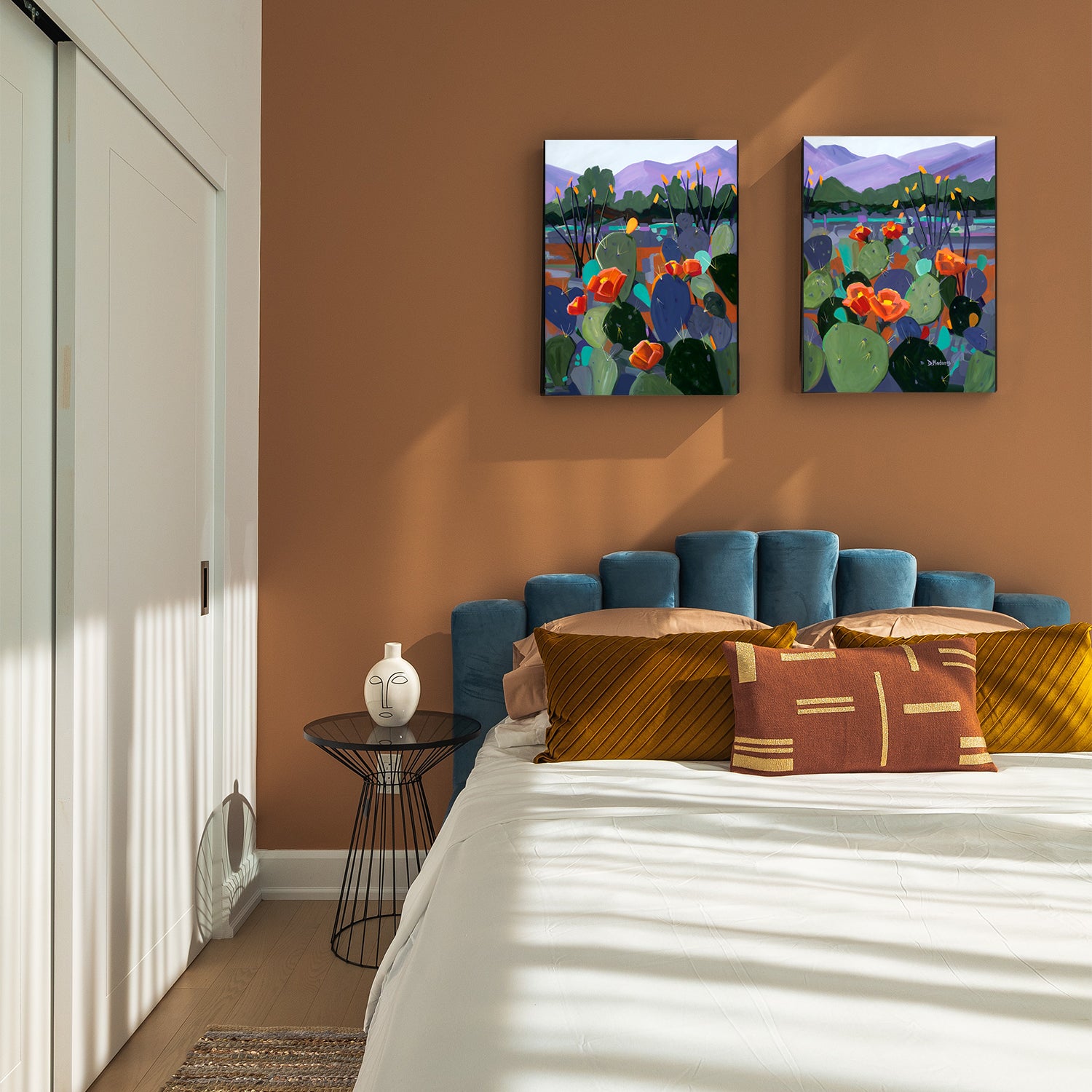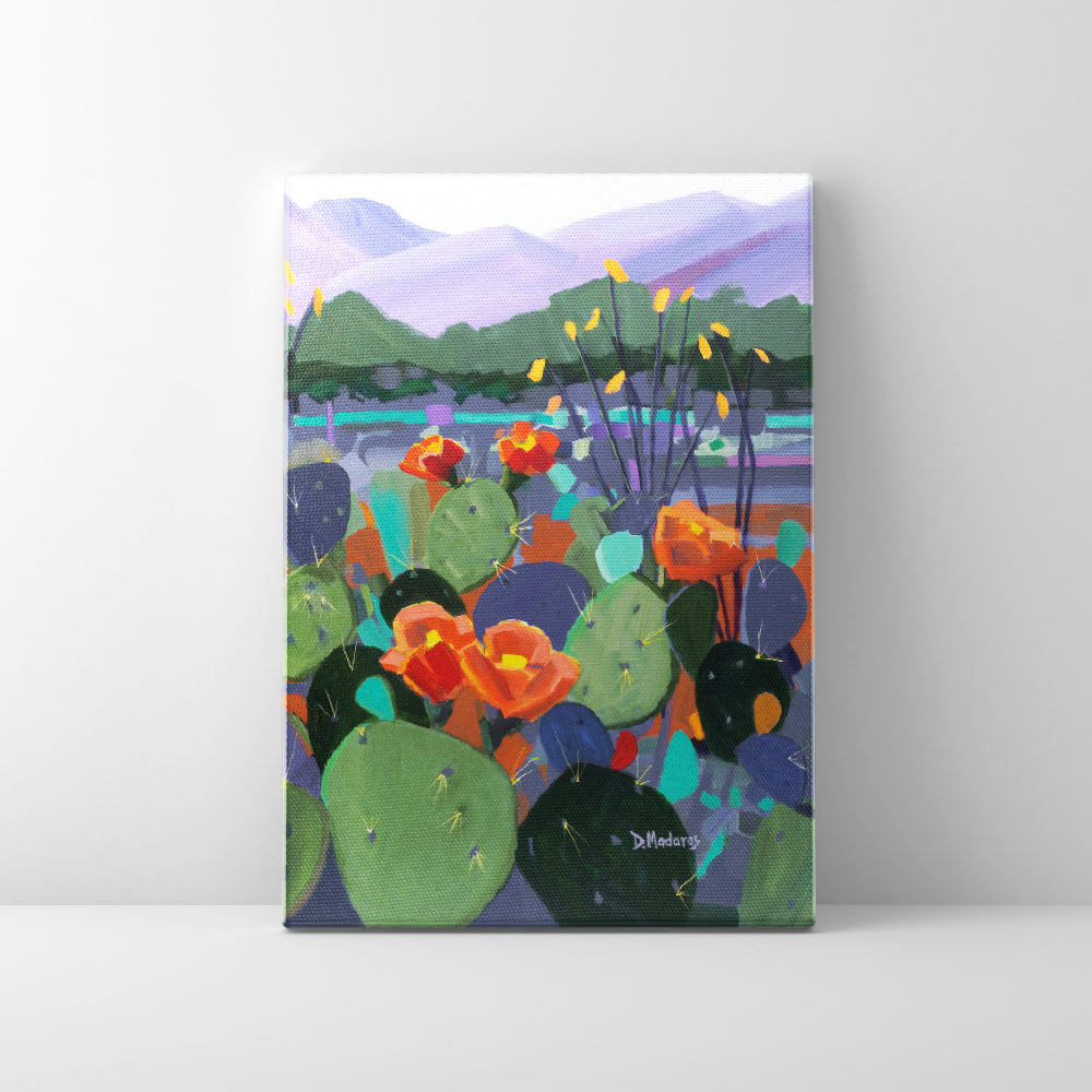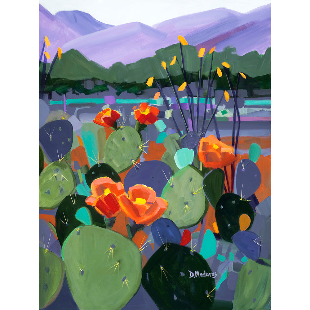 Twin Peaks – This concept started with a photo of some prickly pear cactus in bloom. I “painted” the photo on my computer using a painting app and liked it so much that I decided to do a full scale painting. I named it Twin Peaks because I was listening to Twin Peaks on the TV while painting, then added the second peak as I finished the painting!