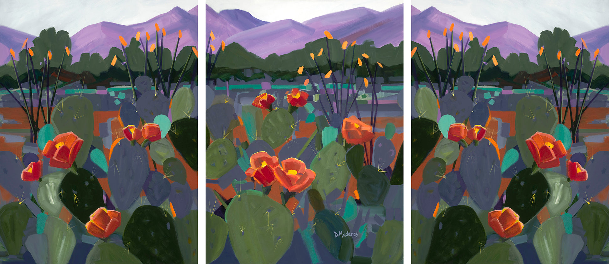 Twin Peaks – This concept started with a photo of some prickly pear cactus in bloom. I “painted” the photo on my computer using a painting app and liked it so much that I decided to do a full scale painting. I named it Twin Peaks because I was listening to Twin Peaks on the TV while painting, then added the second peak as I finished the painting!