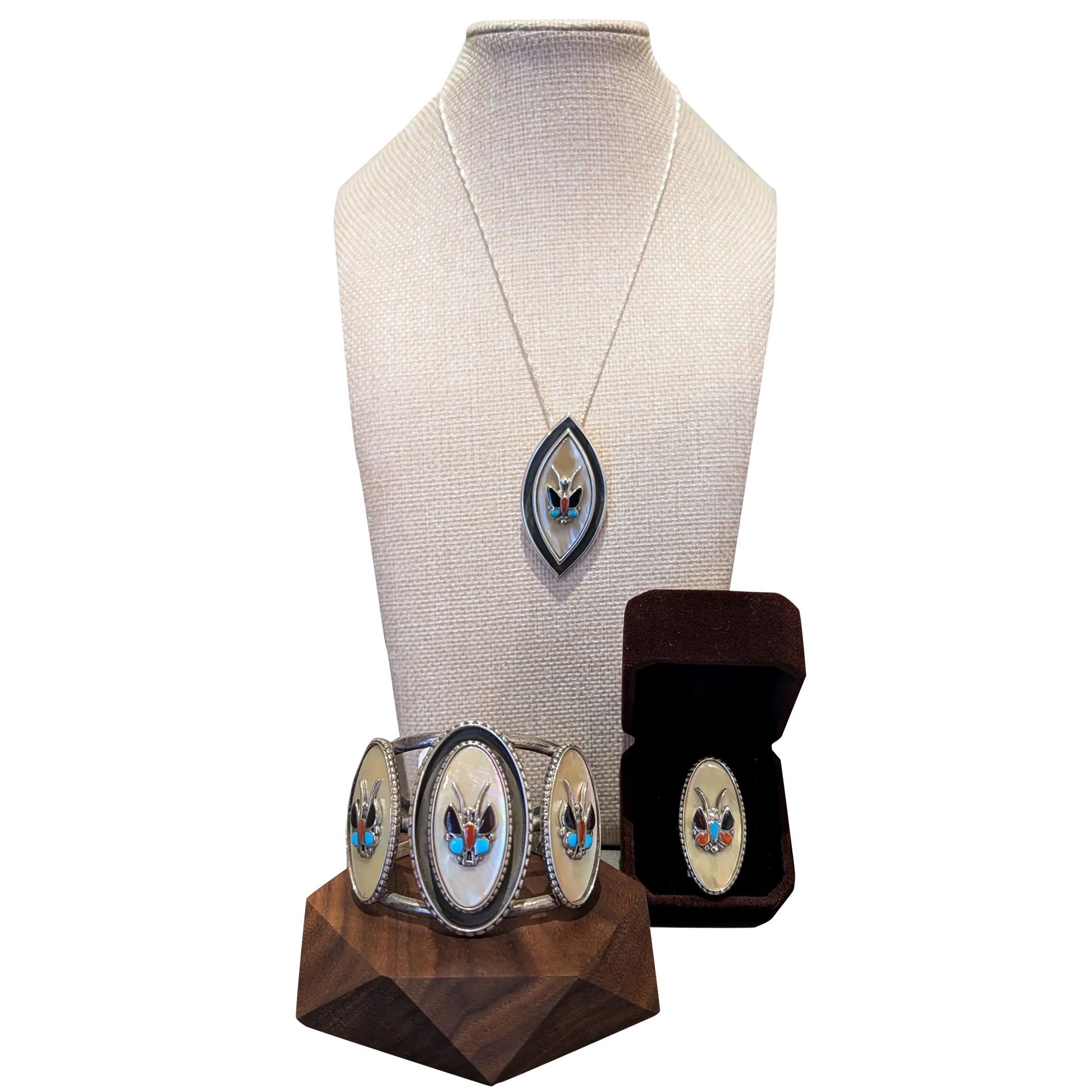Ivan Tsethlikai began his jewelry-making career in the 1970s and became known for his inlay butterfly designs. These three pieces are excellent examples of his work. Turquoise, dark shell and coral are inlaid in a sterling butterfly, which is then mounted on a piece of gold lip mussel shell. The ring is a 6.5, and the bracelet will fit up to a 6-5/8” wrist.