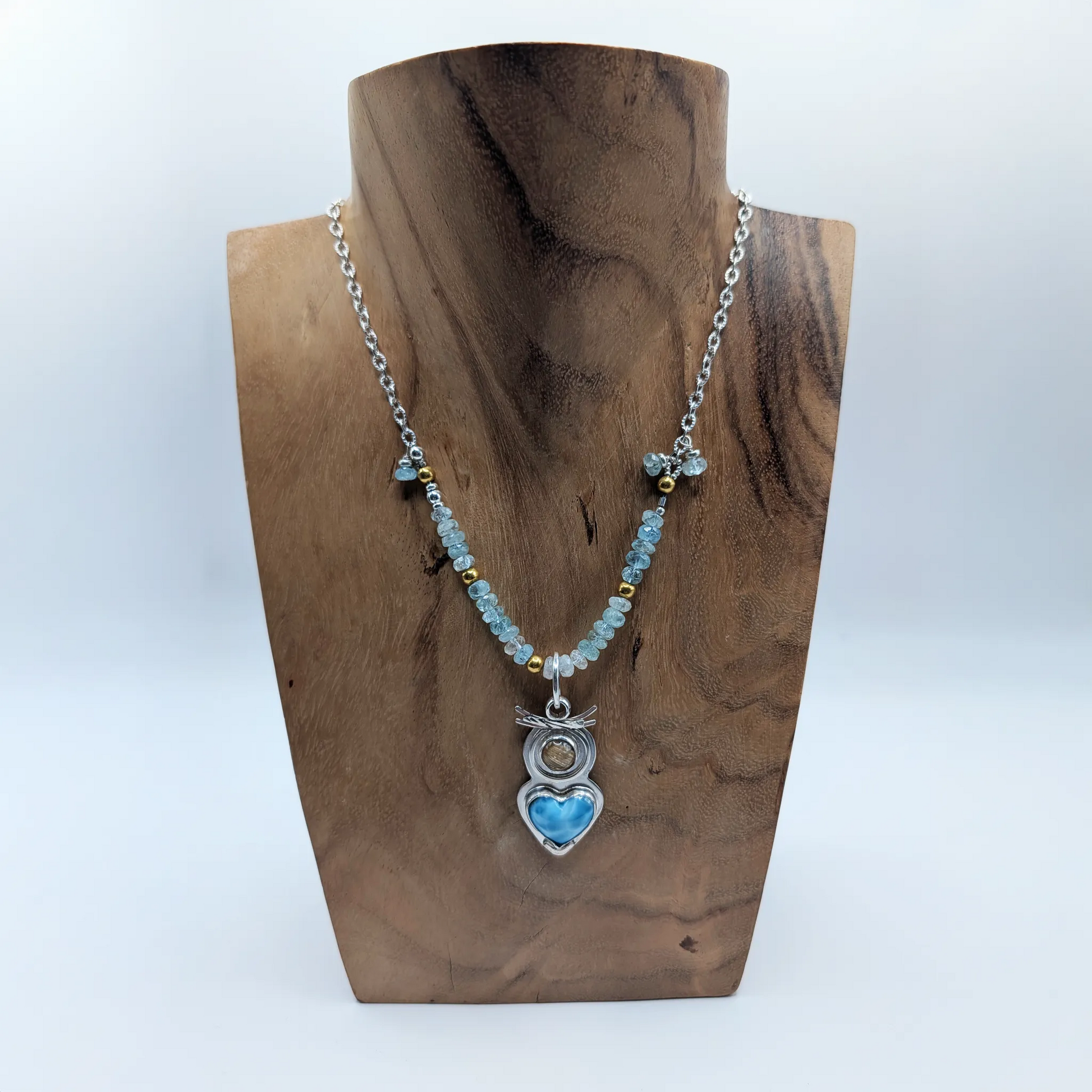 VSTS 188 Pendant hearts of heart, Larimar with Rutilated Quartz stones, Aqua marine stones and 18K accent beads